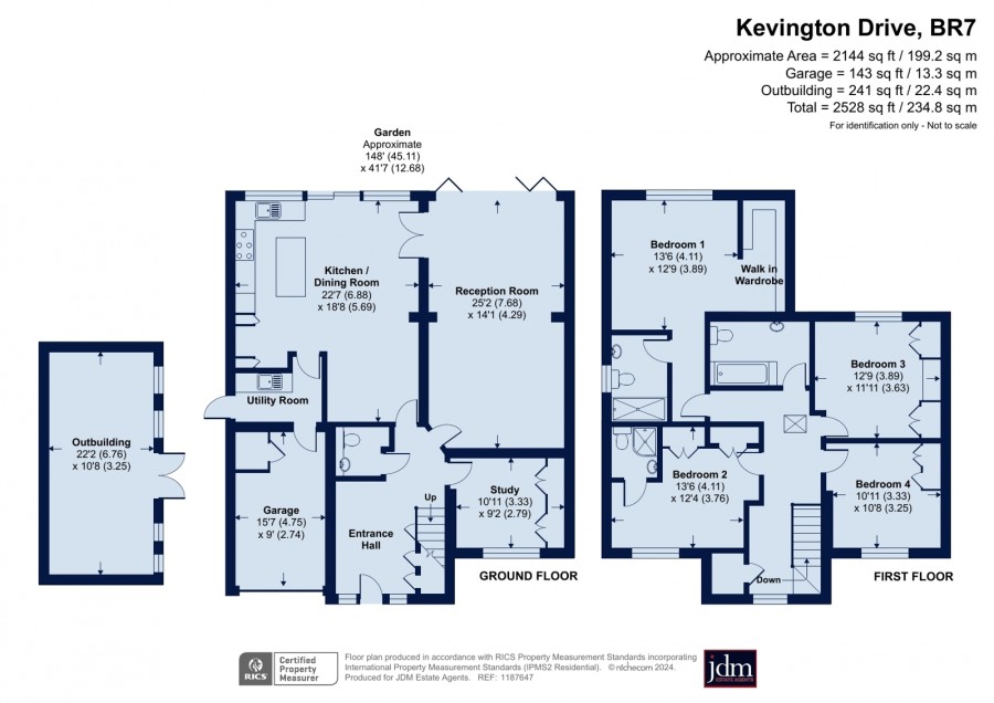 Upstairs, all five bedrooms are well-proportioned. The principal bedroom benefits from a luxurious fully tiled en-suite shower room with a wide walk-in shower, wall-hung basin set within a vanity unit, and a window providing natural light and ventilation. Three of the bedrooms feature fitted wardrobes.